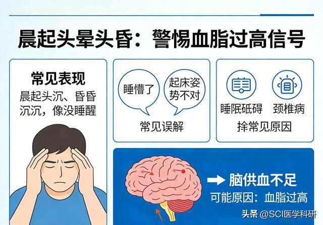 夜间睡眠时,人体的血流速度本身就会减慢。如果血脂本来就高,血液黏稠度增加,早晨起床时脑部血管更容易处于“缺血”状态。大脑对氧气和营养的敏感度极高,一旦供血跟不上,就会用头晕、头昏来提醒你:上游出问题了。