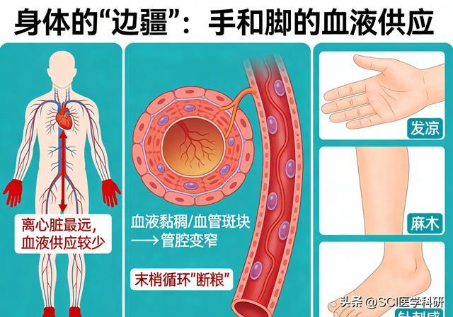 手和脚是身体的“边疆”,离心脏最远,血液供应本身就不如躯干丰富。当血脂升高,血液变得黏稠,流动速度减慢,或者血管壁上已经形成斑块导致管腔变窄,末梢循环最先“断粮”。缺血缺氧的结果,就是发凉、麻木,甚至针刺感。